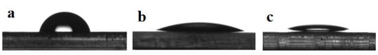 The WCA images of the uncoated blank PC (a), N-coated PC (b), and I-coated PC (c).