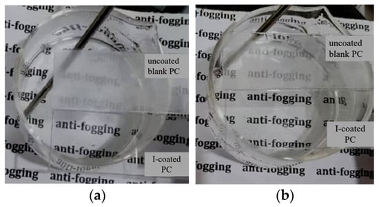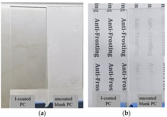 The antifrost performance was evaluated by simulating a transition from a low-temperature environment to a room-temperature setting, to mimic real-world conditions where condensation may occur. Both the I-coated PC and the uncoated blank PC were placed in a refrigerator at −5 °C for 15 min. After this period, the samples were then exposed to ambient air at 25 °C and 60% relative humidity, and the condensation behavior on the surface of the coatings was immediately recorded. In the antifrost test, the I-coated PC removed from the cold environment remained clear and free from condensation, whereas the uncoated blank PC fogged up and became opaque within a short period, as shown in Figure 6a. To visually compare the antifrost performance, a piece of paper with black text was placed beneath the samples, as depicted in Figure 6b. From the top-view images, it was evident that the I-coated PC remained transparent, with the black text clearly visible through the sample. In contrast, the uncoated blank PC appeared opaque, and the black text beneath was indistinct, confirming that the coating successfully prevented the formation of frost and maintained optical clarity.