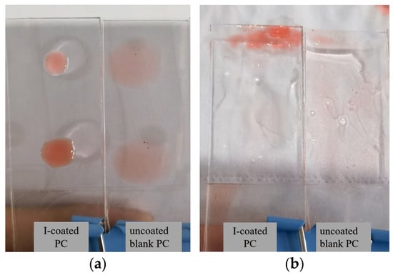 Photographs of the simulated pollutant states on surfaces of the I-coated PC (left) and the uncoated blank PC (right) which were placed horizontally (a) and placed by an angle (30°) of inclination (b).