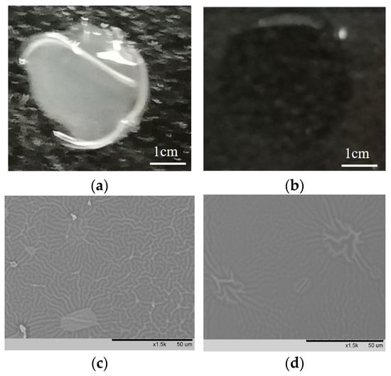 The surface water droplet condition ((a) N-coated PC, (b) I-coated PC) and SEM of N-coat and I-coat after 96 h of water resistance test ((c) N-coated PC, (d) I-coated PC).