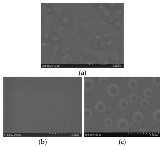 SEM of PC substrate, N-coated PC, and I-coated PC were characterized to clear the effect of hydrophilic modified POSS on the I-coated PC. In Figure 9a, mall particles and cracks not completely melted appeared on the seemingly transparent and smooth PC substrate. The small defects on the surface of the PC substrate were covered by the N-coated PC, but the smaller cracks appeared in the N-coated PC (Figure 9b). There cracks were caused by the subsequent release of the internal stress existing in the surface shrinkage during UV curing of the coating. With the addition of hydrophilic modified POSS, a circular island-like structure appeared in the I-coated PC, containing not only about 300 nm, but also 2–3 micron clusters, and the boundaries between the clusters and the surroundings were blurred (Figure 9c). These isolated islands were caused by the migration, aggregation, and microphase separation of hydrophilic modified POSS to the surface. On the one hand, the rough surface structure formed by these islands could effectively promote the rapid spreading of water droplets on the coating surface to form a film, thereby improving the hydrophilicity of the I-coated PC surface. On the other hand, the inorganic POSS core inside the island could effectively prevent moisture from diffusing into the coating and improve the water resistance of the coating.