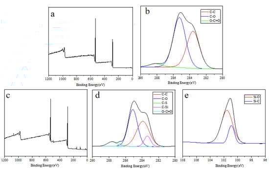 The surface full-spectrum XPS results of the N-coating were shown in Figure 10a, where the peaks appearing at the binding energies of 532.3 eV and 285.2 eV were O 1s and C 1s, respectively. The Figure 10b showed the XPS pattern of the high-resolution C 1s peak. According to the coating composition, C 1s were divided into three Gaussian fitting peaks: O=C–O (288.3 eV), C–O (285.2 eV), and C–C (283.6 eV). A higher proportion of C–O bonds indicated a high content of polyether segments (–CH2–O–) on the surface of the coating, and –CH2–O– imparted hydrophilicity to the coating effectively. The surface full-spectrum XPS results of the POSS-containing I-coating are shown in Figure 10c. The peaks appearing at binding energies of 531.7, 284.8, 162.2, and 101.5 eV were O 1s, C 1s, S 2p, and Si 2p, respectively. Figure 10d is a high-resolution C 1s peak division XPS diagram. According to the coating composition, C 1s can be divided into O=C–O (287.5 eV), C–S (285.6 eV), C–O (285.1 eV), C–C (283.4 eV), and C–Si (284.2 eV) five Gaussian fitting peaks. The ratio of the C–O peak area to the C–C peak area is about 1.1: 1. Figure 10e is a high-resolution Si 2p peak division XPS diagram. According to the molecular structure of POSS, Si 2p was divided into two Gaussian fitting peaks: Si–O (101.5 eV) and Si–C (100.9 eV). The area of the Si–O peak was significantly larger than that of the Si–C bond, and this indicated that the inorganic core of POSS migrated from the inside of the coating to the surface.