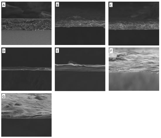 SEM images of cross-section morphology of the films based on (A) CTS/Coll, (B) CTS/Coll + 5%PS, (C) CTS/Coll + 10%PS, (D) CTS/Coll/5TA + 5%PS, (E) CTS/Coll/5TA + 10%PS, (F) CTS/Coll/20TA + 5%PS, (G) CTS/Coll/20TA + 10%PS (the presented images are representative for 3 specimens, mag. 2500×).