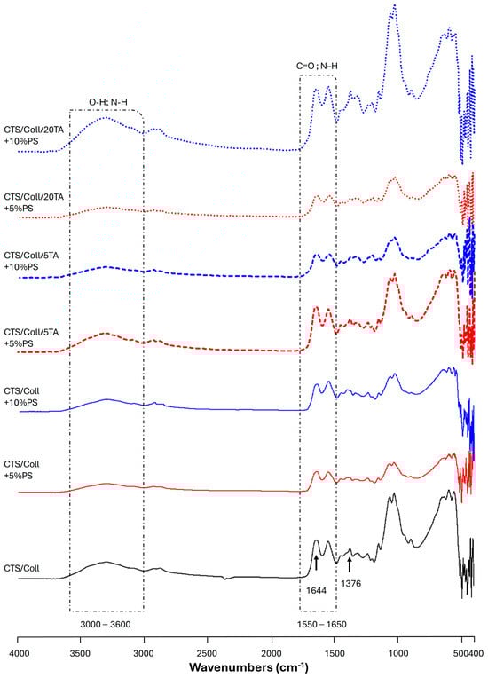 The principal functional groups of both polymers, chitosan, and collagen, may be identified using the vibrational bands shown by the ATR-FTIR spectra presented in Figure 2 and Figure S1. The broad band in the 3600–3000 cm−1 region is attributed to the axial deformations of the O–H and N–H groups, while the absorption bands at ~1544 cm−1 (–NH2), ~1644 cm−1 (amide I band), and ~1315 cm−1 (N-acetyl group) are typical of the polysaccharide structure. Additionally, the spectra display the distinctive absorption bands between 1550 and 1650 cm−1 (C=O and N–H stretching), which are attributed to collagen protein amides I (C=O stretching) and II (N–H bending and C–N stretching). However, for collagen detection, the strong signal always arises between 1700 and 1600 cm−1 []. In the present work, it is observed at ~1644 cm−1. In Figure 2, spectral bands associated with PS can also be detected near 1028 (Figure 2 and Figure S1). These bands are assigned to the asymmetric stretching of the Si–O–Si bond and OH vibration band of water and –SiOH groups, even though it is particularly challenging to analyze the bands due to the partial overlapping []. The characteristic bands of TA at 1703 cm−1 (C=O stretching) and 1173 cm−1 (C–O) are correlated to the aromatic esters (Figure S1). After the TA addition, slight changes were observed in the absorption bands. Indeed, the amide I of CTS/Coll + 10%PS passed from 1645 cm−1 to 1636 cm−1 (CTS/Coll/20TA + 10%PS). Meanwhile, no significant changes were observed for amide II in the presence of TA. The shifts in the major bands in the infrared spectra, particularly the amide I band of the CTS/Coll/TA blends, make it evident how the macromolecules interact, mostly through hydrogen bonds []. Indeed, TA can form hydrogen bonds with the chemical moieties found in collagen and chitosan.