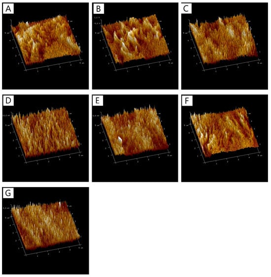 The 3D images of surfaces of films (A) CTS/Coll, (B) CTS/Coll + 5%PS, (C) CTS/Coll + 10%PS, (D) CTS/Coll/5TA + 5%PS, (E) CTS/Coll/5TA + 10%PS, (F) CTS/Coll/20TA + 5%PS, (G) CTS/Coll/20TA + 10%PS.