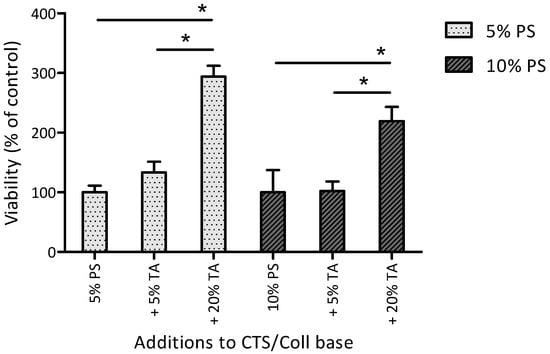 Metabolic activity of BMSC cultured for 6 days on different material films. The results are reported as mean STD (i.e., % change in BMSC metabolic activity on the material surface vs. material control without TA). CTS/Coll films combined in the ratio of 50:50 (w/w%) with the addition of either 5% or 10% PS and 5% or 20% TA. * Statistically significant differences between 5% PS and 10% PS groups.