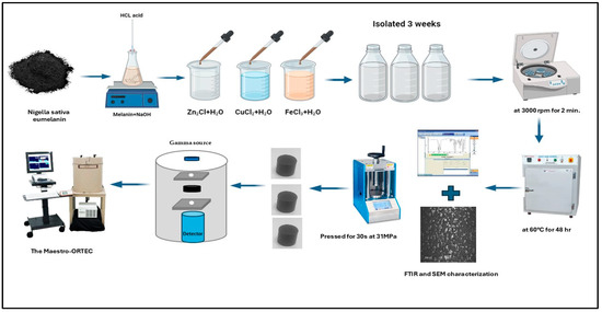 For the preparation of iron-doped eumelanin (Fe-Mel), iron(II) chloride (FeCl3) was added to the eumelanin solution in a 1:10 ratio. The resulting mixture was left in each sample for three weeks while the color changed from red to transparent in the melanin sample with iron chloride, red to transparent in the eumelanin sample with copper chloride, and white to transparent in the melanin sample with zinc oxide. Subsequently, the samples were centrifuged at 3000 rpm for 2 min, and then dried in an oven at 60 °C for 48 h. Similar procedures were followed to create copper-doped (Cu-Mel) and zinc-doped eumelanin (Zn-Mel) using CuCl2 and ZnCl2, respectively. All resulting compounds were all black in color. A PerkinElmer 580 B-IR spectrometer (industrialbid, Las Vegas, NV, USA) was used to obtain Fourier transform infrared (FTIR) spectra. The SERON-AIS 1800C scanning electron microscope (SEM), Seron Technologies Inc., Uiwang, Republic of Korea: was used to study the morphology and has a resolution of ∼20 µm. The APEX™ EDS software program was used for collecting and analyzing energy-dispersive X-ray spectroscopy (EDS/EDX). The synthesis process is illustrated in Figure 1. XRD measurements were conducted using a Discover diffractometer (Bruker (Billerica, MA, USA): D8 with Cu-Kα radiation, λ = 1.5406Å).