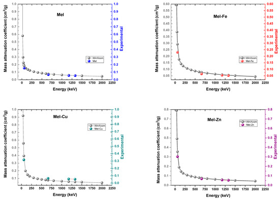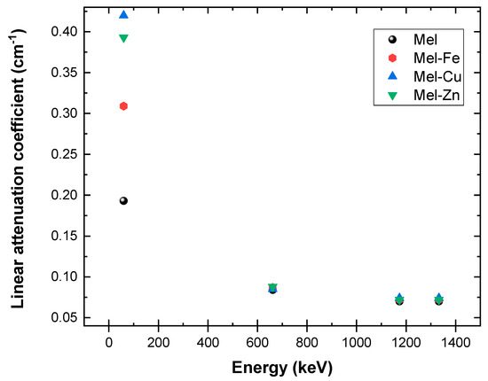 The addition of iron (Fe), copper (Cu), and zinc oxide (Zn) to eumelanin leads to notable changes in both the linear and mass attenuation coefficients, suggesting that these additives enhance eumelanin’s ability to attenuate gamma radiation. The experimental results for four different gamma energies—59.5 keV (from 214Am), 661.7 keV (from 137Cs), 1173.2 keV, and 1332.5 keV (from 60Co)—were obtained by averaging the results for each sample in each photon energy.