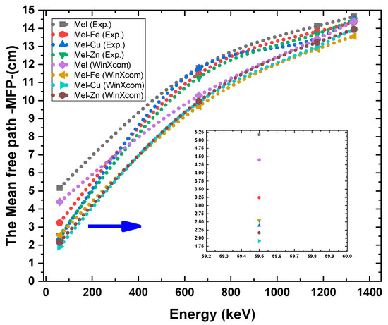 The mean free path (MFP) for the Mel, Mel-Fe, Mel-Cu, and Mel-Zn samples at photon energies of 59.5 keV, 661.7 keV, 1173.2 keV, and 1332.5 keV.