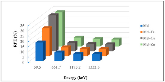 The radiation protection efficiency (RPE) values for eumelanin (Mel) and its composites with Fe, Cu, and Zn indicate significant variations in shielding effectiveness across different photon energies, as shown in Figure 9. At a low energy of 59.5 keV, pure eumelanin exhibits an RPE of 17.581%, which is notably increased by adding Fe, Cu, and Zn, resulting in RPE values of 26.529%, 34.251%, and 32.545%, respectively. This shows that Cu offers the highest improvement in radiation protection at this energy level. As the photon energy increases to 661.7 keV, the RPE values decrease, showing less differentiation between the samples—8.119% for Mel, 8.344% for Mel-Fe, 8.142% for Mel-Cu, and 8.483% for Mel-Zn—indicating a modest enhancement with these additives. At the even higher energies of 1173.2 keV and 1332.5 keV, the RPE values continue to converge, with Mel having 6.833% and 6.597%, Mel-Fe having 6.982% and 6.733%, Mel-Cu having 7.162% and 6.668%, and Mel-Zn having 7.041% and 6.676%, respectively. These results suggest that while Fe, Cu, and Zn significantly improve the radiation protection efficiency of eumelanin at lower energies, their impact becomes more uniform and less pronounced at higher energies.