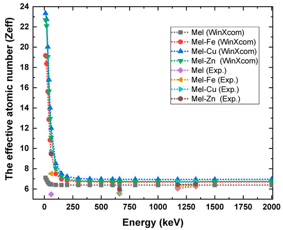 As shown in Figure 10, the effective atomic number (Zeff) results for pure eumelanin (Mel) and its composites with Fe, Cu, and Zn show a significant increase in radiation shielding effectiveness due to metal doping, particularly at lower photon energies. Figure 10 shows that at 59.9 keV the Zeff increases from 5.478 for pure eumelanin to 7.514 for Mel-Fe, 9.655 for Mel-Cu, and 9.462 for Mel-Zn, demonstrating that Cu provides the highest enhancement. As the photon energy increases, the Zeff values for all samples converge, indicating less variation between the doped and undoped samples. At 661.6 keV, the Zeff values are 5.544 for Mel, 5.645 for Mel-Fe, 5.831 for Mel-Cu, and 5.980 for Mel-Zn, while at 1332 keV they are 6.253, 6.342, 6.681, and 6.483, respectively. This convergence suggests that the impact of metal additives on Zeff is more pronounced at lower energies, where radiation shielding improvements are more significant, highlighting the potential of Cu-doped eumelanin for optimized shielding applications.