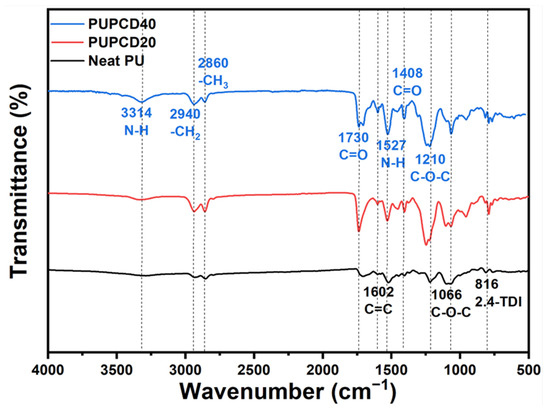 FT-IR spectrum of Neat PU, PUPCD20, and PUPCD40.