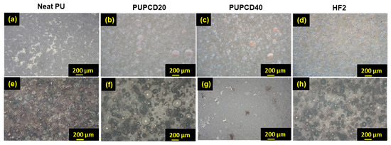 The optical micrographs of (a,e) Neat PU, (b,f) PUPCD20, (c,g) PUPCD40, and (d,h) HF2 pad surface comparison before and after the 12 h CMP process at the same magnification, respectively.