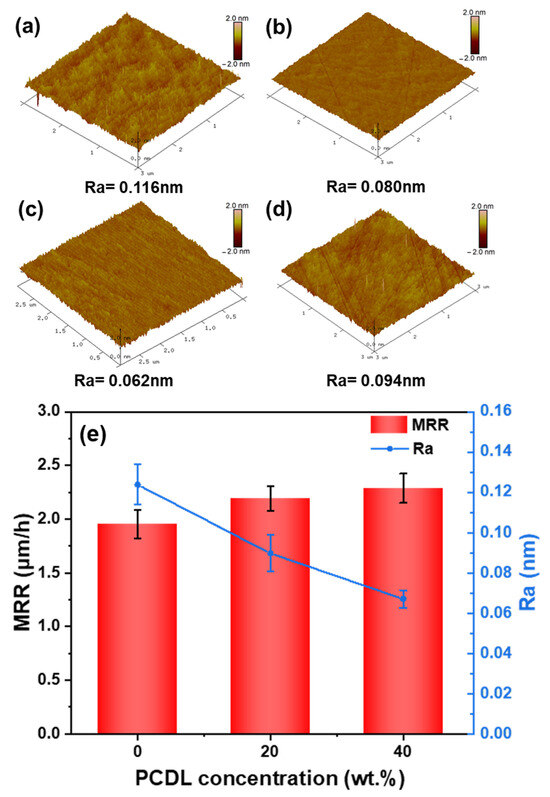 AFM images of the Si-polar surface center point of the SiC substrate with different PCDL contents: (a) Neat PU, (b) PUPCD20 (20 wt.%), (c) PUPCD40 (40 wt.%), (d) HF2 (commercial pad), and (e) variation diagram of average surface roughness and material removal rate with different PCDL contents.