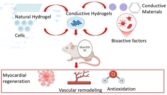 Biomaterials encompass a wide range of materials, including ceramics, metals, composites, and polymers, which vary in size from macro to micro and nano scales. These substances can be utilized to replace or mend damaged tissues in living creatures []. They serve as scaffolding for cells’ continuous division and proliferation and are crucial for anchoring cells. They can be employed in tissue engineering in various ways, such as carriers, hydrogels, and scaffolds []. Biomaterial form and function should closely mimic the natural properties of the cardiac extracellular matrix (ECM) to support cardiac tissue engineering. It should also provide an appropriate microenvironment to improve cell survival [,]. In particular, biomaterials intended to facilitate cardiac repair ought to be both biocompatible and biodegradable, possess characteristics of a native myocardium in terms of both mechanical and biological aspects, facilitate cell integration, lessen the antagonistic nature of the surrounding milieu, guarantee a gradual release of bioactive molecules, and offer a suitable electrical conductivity [,,].Furthermore, the incorporation of antioxidant compounds into biomaterials may act as a mediator between fibrosis and inflammation. By eliminating reactive oxygen species, antioxidant structures can reduce oxidative damage, the fibrotic response to heart repair, and the pro-inflammatory polarization of macrophages [].