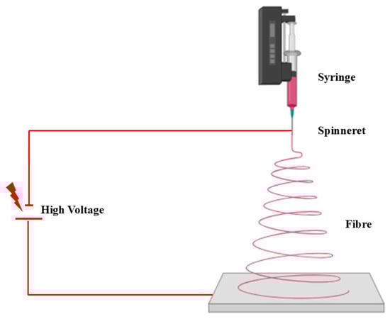 Electrospinning is a fabrication method frequently used alongside additive manufacturing techniques, particularly in cardiovascular tissue engineering (CTVE). One of the key objectives in CTVE is to create graft materials that remain effective over time, integrate with living tissue, and replicate the properties of native organs. Electrospinning is a common technique used to fabricate large quantities of uniform fibers at the nanometer and micrometer scale. A polymer solution is loaded into a syringe pump, and a high voltage is applied to a conductive needle, causing the extrusion of fibers or microbeads. These fibers are collected on a grounded metal mandrel. By adjusting various process parameters, the alignment and diameter of the electrospun fibers, which range from 100 nm to 5 μm, can be precisely controlled. Figure 3 illustrates a schematic representation of an electrospinning apparatus. The syringe pump controls the rate at which the polymer solution is dispensed, enabling the precise fiber formation [,,].