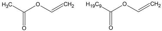 Representative chemical structures of monomers vinyl acetate (left) and neodecanoic acid vinyl ester (right).