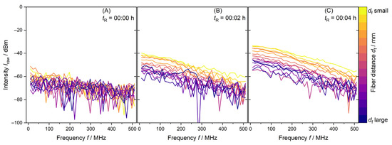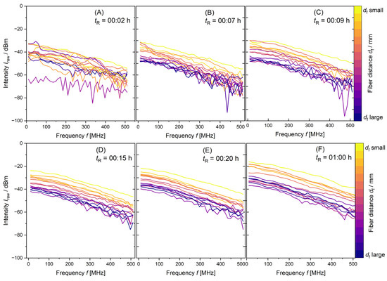 Figure 3 shows PDW spectroscopy data Iraw over the modulation frequency f of all measured distances taken from a 10 L synthesis. From Figure 3A–F, the synthesis proceeds from tR = 00:02 h to tR = 01:00 h reaction time. The intensity Iraw values for the smallest df (yellow line) and smallest modulation frequency f (10 MHz) increase with increasing reaction time from −30 to −18 dBm. The intensity of the measurement with highest df (purple line) and smallest modulation frequency increases from approx. −60 dBm with high noise to above −40 dBm. In a homogeneous dispersion, the measured intensity Iraw would decrease from df small to df large (from yellow to purple). With the proceeding polymerization, the reaction mixture becomes more turbid. More and larger particles contribute to absorption and scattering in the measurement path length. The detected inconsistencies by PDW spectroscopy in Iraw by means of a deviated order from the smallest to biggest measurement distances df are very useful to check if a polymerization process is progressing as desired.