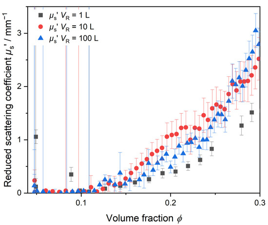 Figure 6 shows offline-determined mean particle sizes by DLS for each reaction volume up to a volume fraction of ϕ = 0.3. The final products from the reactions should have the same properties like particle size and particle size distribution and therefore the same reduced scattering coefficient µs’. From these offline measurements, it is evident that the growth of particles between the reaction volumes differs already at early reaction stages. Already at low volume fractions less than ϕ < 0.2, a difference in the determined mean particle size is detectable. The smallest reaction scale of 1 L reaction volume (black squares) produces the smallest particles. Exceeding ϕ > 0.2, the 100 L synthesis (blue triangles) contains particle aggregates in the micrometer size regime, with high deviations between the measurements indicated by the very big error bar. As the reduced scattering coefficient µs’ strongly depends on the particle size within the dispersion, the deviations of the trends between the reaction scales are far earlier detected by PDW spectroscopy in real-time in Figure 3 and Figure 4. From the DLS data in Figure 6, it can be derived that the final particle sizes in the dispersions differ from each other. To achieve a successful scale-up procedure leading to equal properties across reaction scales, PDW spectroscopy can determine deviations already at low volume fractions in real-time much faster than common offline analysis.