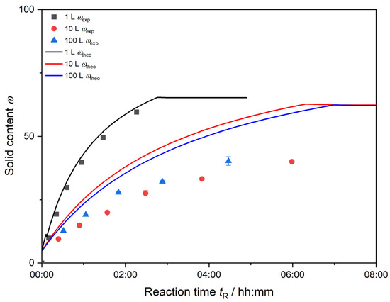 Figure 5 shows the experimental and theoretical solid content of each synthesis over the reaction time. The experimentally determined solid content ωexp deviates from the theoretical amount of solids at 100% monomer conversion. This deviation is relatively small for a total reaction volume of 1 L. Due to sufficient mixing, the conversion of monomer to polymer is high, and little deviation between theoretical and experimental solid content ω is detected. The difference between ωtheo and ωexp is the largest for the 10 L synthesis. The further each synthesis proceeds, the more divergence between theoretical solid content ωtheo and measured values ωexp is observed. The redox initiator and monomer mixture are dosed into the dispersion at very low feed-rates. In the beginning of the synthesis, the small amount of monomer added to the dispersion is still quickly converted to a high extent. The further the synthesis proceeds, the deviation increases, and the non-converted monomer stays unreacted within the dispersion.