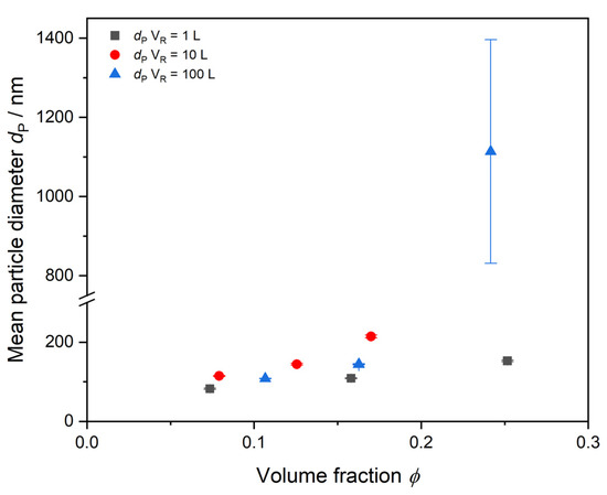 Volume-based mean particle diameter determined by DLS up to a volume fraction of ϕ = 0.3. Volume fractions have been calculated based on experimentally determined conversion data (cf. Figure 5). Depicted error values are standard deviations of three DLS replicate measurements.