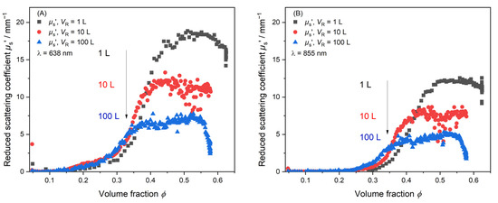 Figure 7 shows the reduced scattering coefficient µs’ of three syntheses monitored over the complete reaction course in dependence of the volume fraction ϕ. ϕ > 0.57 is reached for all reaction volumes. Figure 7 shows PDW spectroscopy measurements at two different wavelengths, λ1 = 638 nm (Figure 7A) and λ2 = 855 nm (Figure 7B), respectively. An initial increase phase, a plateau phase and a decrease in scattering can be observed. A deviation of the µs’ trends between different scales occurs around ϕ = 0.15 at λ = 638 nm and ϕ = 0.25 at λ = 855 nm. For all three reaction volumes, a plateau phase of µs’ is found. In this plateau, the µs’ value decreases with increasing reaction volume from µs’1 L = 18 mm−1 to µs’10 L = 12 mm−1 and µs’100 L = 7 mm−1. The difference in the plateaued µs’ value indicates that the used scale-up procedure by Jacob et al. might not maintain particle properties in the final dispersion throughout reaction scales. It indicates that the particle growth phase between the reactions deviate from one another. To underline this, a second PDW spectroscopy measurement at λ2 = 855 nm is simultaneously analyzed. Figure 7B also shows a deviation in the final µs’ values. Compared to Figure 7A, the discrepancy between the final µs’ values in Figure 7B decreases. The final values are µs’1L ≈ 12 mm−1 to µs’10L ≈ 8 mm−1 and µs’100L ≈ 5 mm−1. Taking all the inline data produced by PDW spectroscopy into account, it is determined in real-time that the final particle properties will deviate from each other.