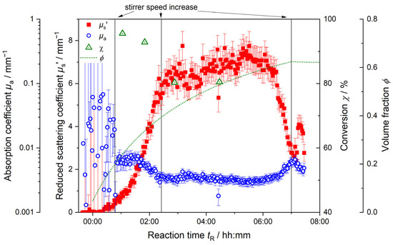 Figure 8 displays the inline trends of the reduced scattering coefficient µs’ and the absorption coefficient µa as well as the total volume fraction ϕ over time and the total conversion χ for a 100 L synthesis.