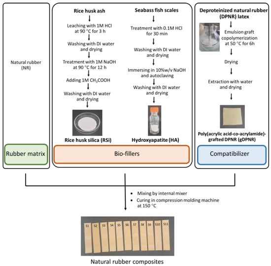 Rice husk ash was obtained from Chia Meng Co., Ltd. (Nakhon Ratchasima, Thailand). Seabass fish scales were sourced from a local shop (Rayong, Thailand). Natural rubber latex, treated with high ammonia and a dry rubber content of 60 wt%, was purchased from Chemical and Materials Co., Ltd. (Bangkok, Thailand). Sodium dodecyl sulfate (SDS) and acrylamide (AM) were supplied by LOBA Chemie Pvt. Ltd. (Mumbai, India). Urea, hydrochloric acid (HCl), and toluene were provided by RCI Labscan Co., Ltd. (Bangkok, Thailand). Acrylic acid (AA), cumene hydroperoxide (CHP), and 1-[3-(Trimethoxysilyl)propyl]urea coupling agent (CA) were supplied by Aldrich (St. Louis, MO, USA). AA was passed through a column packed with alumina adsorbent before use. Sodium hydroxide (NaOH) and acetic acid (CH3COOH) were sourced from CARLO ERBA Reagents (Milan, Italy). Tetraethylene pentamine (TEPA) was supplied by Acros Organics (Geel, Antwerp, Belgium). Teric (10 wt%, N-cyclohexyl-2-benzothiazole sulfenamide (CBS), and tetramethylthiuram disulfide (TMTD) were purchased from the Rubber Authority of Thailand (Bangkok, Thailand). Ethanol was supplied by Duksan Reagents (Ansan, Gyeonggi, Reublic of Korea). Stearic acid (SA), zinc oxide (ZnO), and sulfur (S) were provided by Chemical Innovation Co., Ltd. (Bangkok, Thailand).
