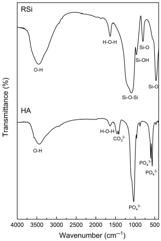 The chemical functional groups of rice husk silica and hydroxyapatite particles were analyzed using FTIR spectroscopy (TENSOR 27, Bruker, Billerica, MA, USA). The samples were mixed with potassium bromide using an agate mortar and pressed into pellets to prepare test specimens with smooth surfaces for transmittance measurements. The measurements were performed in the wavenumber range of 4000 to 400 cm−1, with a resolution of 4 cm−1 and 64 scans.