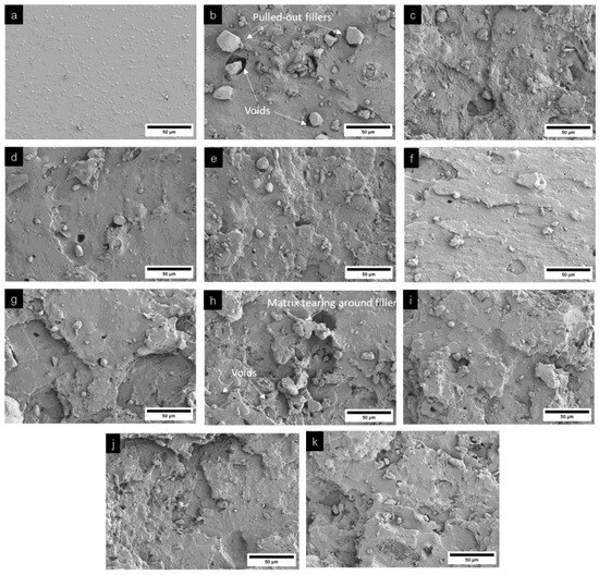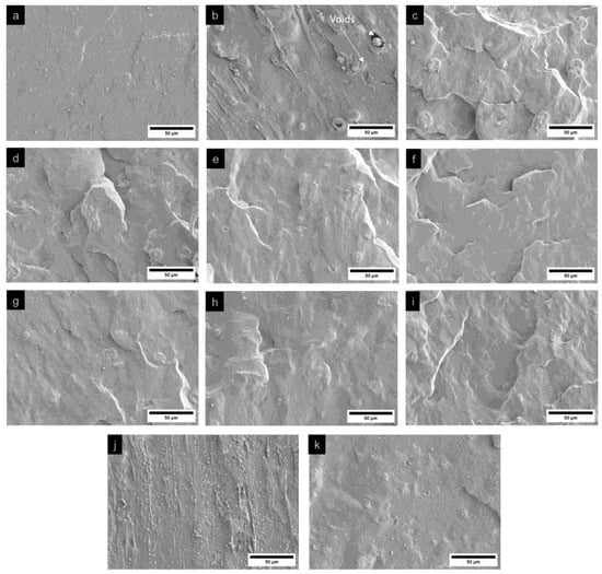 SEM images of the fracture surfaces of (a) sample 1, (b–f) samples 2–6, (g–j) samples 7–10, and (k) sample 11, subjected to tensile testing.