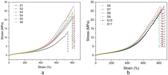 Stress–strain curves of (a) samples S1–S6 and (b) samples S5, S7–S11.