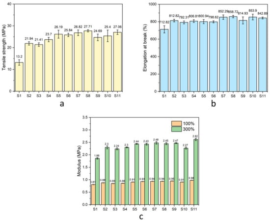 The (a) tensile strength, (b) elongation at break, and (c) modulus at 100 and 300% strain of the natural rubber composites.