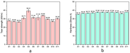 The (a) tear strength and (b) hardness of the natural rubber composites.