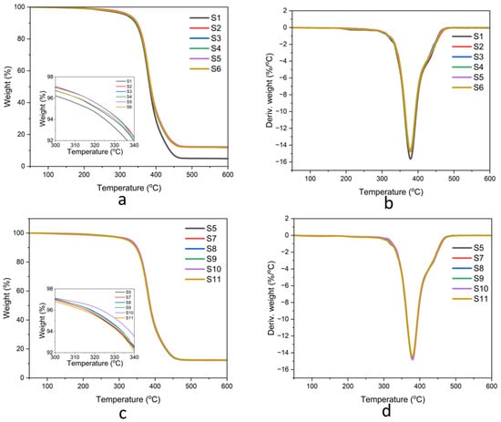TGA and DTG thermograms of natural rubber composites: (a,b) samples S1–S6 and (c,d) samples S5, S7–S11.