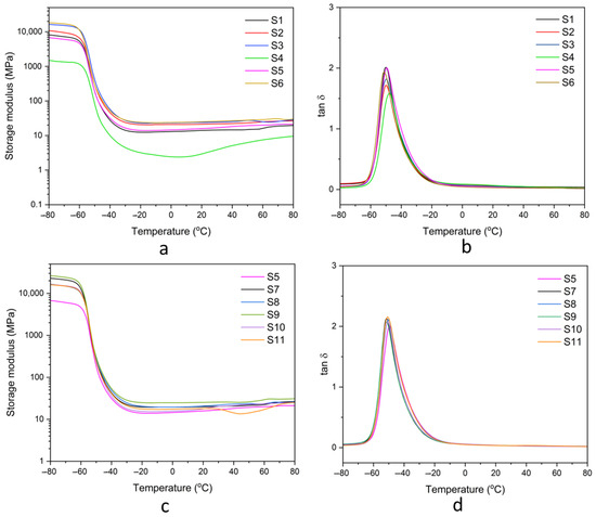 Storage modulus and damping factor of natural rubber composites: (a,b) samples S1–S6 and (c,d) samples S5, S7–S11.