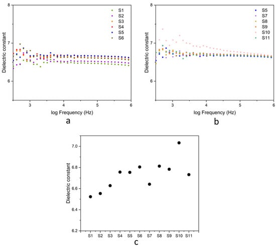 Dielectric constant of natural rubber composites: (a) samples S1–S6; (b) samples S5, S7–S11; (c) measurements at 1 kHz.