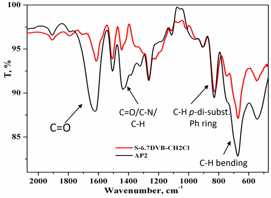 The FTIR spectra of the glycine-functionalized copolymer (AP2) and the pristine copolymer S-6.7DVB-CH2Cl are displayed in Figure 1. A slight increase for the adsorption band from 1621 cm−1 has been assigned to the stretching vibrations of the C=O [17], and it is shown in the spectrum for AP2. The higher intense broadband at 1421–1324 cm−1, which corresponds to CO/C-N/C-H, stretching/bending vibrations, suggests the presence of amino acids [18,19] and indicates that the copolymer has been functionalized. Figure 2 presents the SEM image of the copolymer AP2. As can be seen, the AP2 sample displayed a relatively smooth surface with some defects.