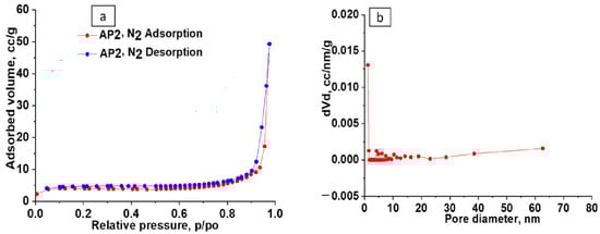 The BET isotherm corresponds to type IV, indicating the uniformity and regularity of the textural properties of the AP2 copolymer. This type of isotherms is usually associated with capillary condensation in mesoporous structures [20,21,22]. The BET surface area of the AP2 copolymer, calculated by applying the BET equation to the linear part of the adsorption isotherm (0.05 < p/po < 0.305), is 15.856 m2/g. According to IUPAC classification, the pores in porous materials are classified into micropores (width less than 2 nm), mesopores (width between 2 and 50 nm), and macropores (width greater than 50 nm) [20]. The distribution of pore diameters in Figure 3b would indicate that the majority of pores are located in the range of 3–50 nm, and this shows a mesoporous structure for this copolymer.