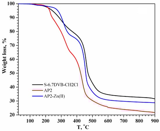 TG analysis for S-6.7DVB-CH2Cl, AP2, and AP2-Zn(II) samples recorded in nitrogen atmosphere.