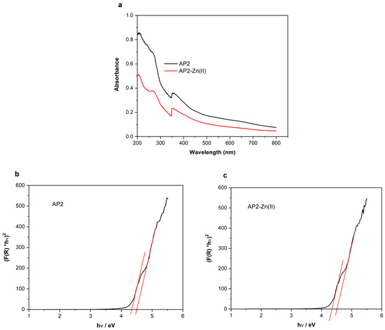 The band-gap energies resulting from Kubelka–Munk transformations are 4.338 eV and 4.506 eV for AP2 and 4.354 eV and 4.523 eV for AP2-Zn(II), respectively. The values of the band-gap energies are close to each other, and it is expected that the behaviors of the two materials will recommend them as photocatalysts. Such band-gap energy values have been reported for polymers [24,25].