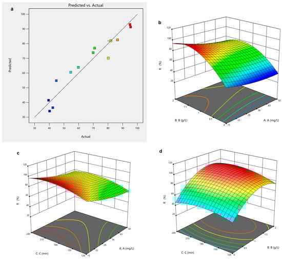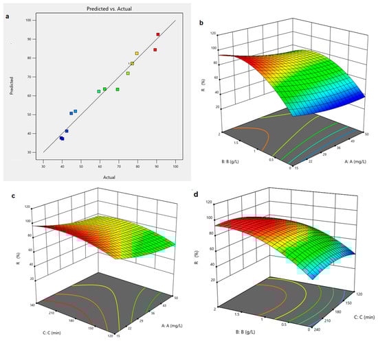 The goodness of the model’s fit is also reflected in the graphical representation of the values of the process efficiencies predicted vs. actual or experimental results, as can be seen from Figure 8a and Figure 9a. The effect of the three independent parameters on the efficiency of the photocatalysis process is also presented by the response surface contour plots in Figure 8b–d and Figure 9b–d. It is observed that, in both cases, in order to obtain maximum efficiency of the photocatalysis process, it is necessary that the initial concentration of the dye be low, the solid–liquid ratio be high, and the reaction time be long.