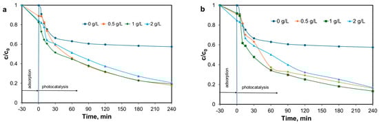 After 240 min of photocatalysis, the photocatalytic efficiencies of the two materials become similar, and the different S–L ratios no longer play such an important role. Probably, during the photocatalysis process, once the process of generating oxidizing species and initiating radical degradation reactions have occurred, the recombination of electron and hole can increase, resulting in the overall dye degradation process being slowed down. It is observed that slightly lower final yields are obtained if the S–L ratio is 2 g/L, probably because a large amount of catalyst can play the role of a trap for the recombination of oxidizing species.
