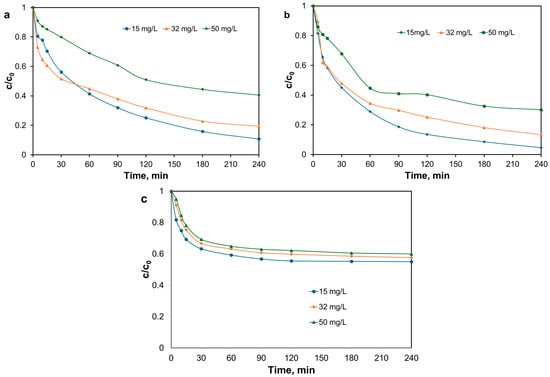 The photocatalytic degradation process of the CR dye was studied by following the variation of the CR concentration over time, depending on (i) the type of photocatalyst (AP2 or AP2-Zn(II)); the solid–liquid ratio (S–L = 0.5, 1 and 2 g/L); the initial concentration of CR (c0 = 15, 32 and 50 mg/L). Further experiments were performed to observe the behavior of dye solutions upon exposure to light radiation without an added photocatalyst (photolysis). Starting from the initial concentration of CR of 32 mg/L, the decrease in concentration as a function of time was studied for three doses of catalysts (S–L ratio of 0.5, 1 and 2 g/L) compared to the photolysis process, and the results are presented in Figure 10. It is observed that, without the input of catalysts, the process of CR removal (photolysis) proceeds at a high ratio in the first 30 min, and then the concentration of the dye remains almost constant; after 240 min of photolysis, only 42.4% of the initial dye is removed. During the 30 min of dark adsorption, both catalysts retain less than 20% of the concentration of CR present in the solution. Given that the dye oxidation process takes place on the surface of the catalyst, a high degree of adsorption would prevent light radiation from accessing this surface, and the initiation of the dye oxidation process would be prevented. Both types of material used as a photocatalyst, AP2 or AP2-Zn(II), as well as the different doses of photocatalyst, have an influence on the ratio of the CR degradation process, especially in the first part of the process, when the rate of degradation is high. On the other hand, after 240 min of photocatalysis, the degrees of CR removal from water have values of 80% and above, but they are not influenced to a large extent, either by the type of photocatalyst or by its dose.