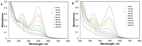 Recorded UV–Vis spectra of the CR solutions during photocatalysis by using AP2 catalyst (a) and AP2-Zn(II) catalyst (b). c0 = 15 mg/L, S–L = 1 g/L.