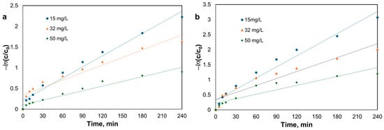 From Table 2, it can be seen that photolysis has the lowest rate constants, the process taking place at a higher rate in the first 60 min (see Figure 11c), and then the reaction rate becomes very low. It is also observed that photocatalysis is well represented by pseudo-first order kinetics model (R2 > 0.95). The apparent rate constants ka are higher in the case of using the AP2-Zn(II) material than in the case of using the AP2 material as photocatalysts. Also, the rate constants decrease with the increase in the initial concentration of CR dye.