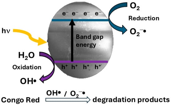 The mechanism of photocatalysis can occur as follows (Scheme 2): as a result of UV light absorption by the catalyst, electrons (e−) are excited to a higher energy level, leaving behind positively charged holes (h+). The electrons (e−) react with dissolved oxygen (O2) to form superoxide radicals (O2−●), while the holes (h+) react with water (H2O) to form hydroxyl radicals (HO●). The generated reactive species (HO● and O2−●) decompose the Congo red dye, resulting in degradation products.