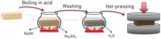 The second step involved thermo-mechanical processing. The blocks were hot-pressed in a steel mold for 24 h at 100 °C under 3 MPa pressure. This compressed the cell walls, causing them to collapse while preserving the fibers, resulting in greater density and strength (see Figure 1).