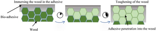 To enhance the robustness of substrate edges, an adhesive infusion process was applied, leveraging the superior strength of the bio-adhesive compared to the wood matrix, especially lignin. The process involved two phases. In the first phase, the substrate surface was evenly coated with the bio-adhesive using a brush. This ensured uniform distribution and thorough absorption into the wood fibers, creating a solid foundation for bonding. In the second phase, the substrate was immersed in an adhesive bath for an hour. This step allowed deeper penetration of the adhesive into the wood, reaching otherwise inaccessible areas and reinforcing the bond (see Figure 3). This method significantly strengthened the adhesive–wood interaction, as reflected in the mechanical properties shown in Table 4 [26].