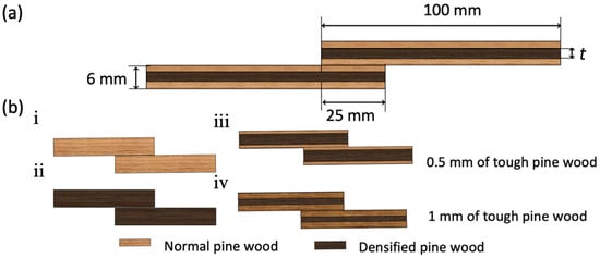 SLJ geometry, where t is the densified wood thickness (0, 4, 5, and 6 mm) (a), and tested joint configurations (b).