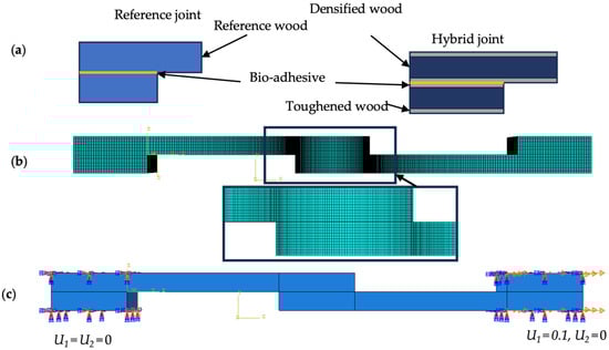 This section presents the numerical simulation of the SLJ under static and high rate using ABAQUS/Explicit. To streamline the analysis and minimize computational effort, a two-dimensional (2D) model was utilized to replicate the joint’s behavior under static and intermediate loading conditions, with the assumption that stress distribution across the SLJ’s width remains consistent. The objective of the simulation was to simulate the failure mode and the load–displacement curve of the joint, and to compare the stress distribution along the bondline in different configurations. The primary goal was to predict load-displacement behavior and failure modes. Numerical results were compared to a representative experimental curve. Due to strain rate effects on viscoelastic materials, strength improved by 15% under intermediate-rate conditions. Substrates were assembled with a 25 mm overlap using cohesive contact, adhering to the properties in Table 2. The geometry and mesh of the bio–single-lap joint model are shown in Figure 3 and Figure 6. The joint consisted of two wood-based substrate and one bio-adhesive layer. The dimensions of the substrates were 100 mm × 25 mm × 6 mm, and the dimensions of the adhesive layer were 25 mm × 25 mm × 0.02 mm. The material properties of the bio-adhesive and the wood-based substrate were obtained from the experimental tests described in Section 2. The bio-adhesive was assumed to be isotropic and cohesive, with the properties presented in Table 4. The wood-based substrate was assumed to be orthotropic and elastic, with different Young’s moduli, Poisson’s ratios, and shear moduli along the longitudinal, transverse, and normal directions. The values of these parameters are given in Table 1. Cohesive quadrilateral elements with four nodes were used in the model; the smallest elements were 0.3 × 0.01 × 0.5 mm. The mesh was refined near the overlap region to capture the stress concentration and damage evolution. Mesh refinement occurred in regions with significant stress gradients, using single and double biasing (0.01 and 0.05) along the substrates and bondline in the x-direction. Uniform mesh distribution was applied along end tabs (Figure 6c). The boundary conditions were applied by fixing one end of the joint while displacing the other end along the x-direction only. In all tests conducted, the wood samples demonstrated elastic deformation, leading to the presumption of linear elastic behavior for the substrates. The model incorporated quadrilateral mesh elements with four nodes under plane stress conditions. To forecast the onset and growth of potential damage and delamination in the substrates, a cohesive zone model (CZM) was applied. This model utilized four-node cohesive quadrilateral elements to represent the substrate behavior, adopting a bilinear traction-separation law shaped by the mechanical and cohesive characteristics of pine wood. The CZM elements, accounting for the experimentally observed delamination thickness, were integrated into both standard and toughened substrates to accurately depict the delamination process. The cohesive elements’ thickness was determined based on the average delamination thickness recorded in the experiments. For simulating adhesive behavior, cohesive contact was established between the two substrates, reflecting the properties of the bio-adhesive. In areas experiencing pronounced stress gradients, mesh refinement was achieved through size reduction of the elements.